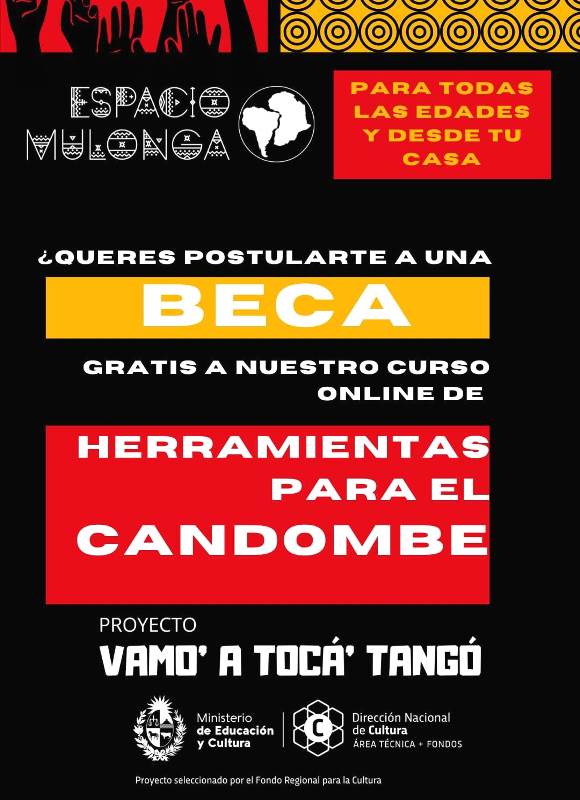 El proyecto Vamo‘a toca‘ Tango‘, de Espacio Mulonga, resultó seleccionado por los Fondos Regionales para la Cultura del MEC. Se trata de un curso virtual de formación integral de Candombe, cuyo contenido incluye, entre otros temas: toque, danza, personajes, herramientas para el Candombe, voces de referentes de la cultura afrouruguaya, perspectiva socio-histórica y étnico racial.