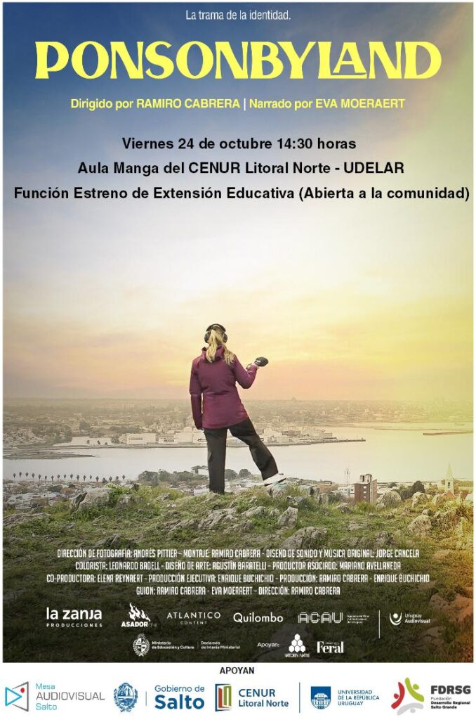 Hoy viernes 24 de octubre, a las 14:30 horas, se realizará la función de estreno del documental Ponsonbyland, en el Aula Magna del CENUR Litoral Norte de la UDELAR. Para la instancia han sido invitados los liceos, la escuela técnica, el CeRP y el IFD y se hace extensiva la actividad a la comunidad universitaria y a la comunidad de Salto en general.