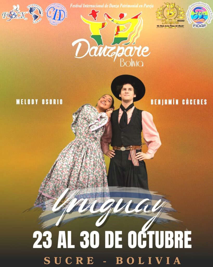 El Festival se desarrolla en esta oportunidad en Sucre, Bolivia, del 23 al 30 de octubre. Los bailarines Melody Osorio y Benjamin Cáceres componen la pareja que representa a Uruguay, junto a la compañía de danza Transitando Huellas.