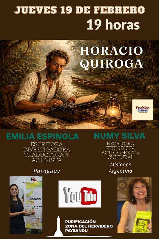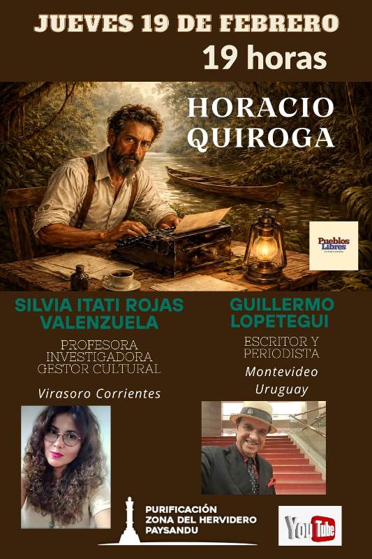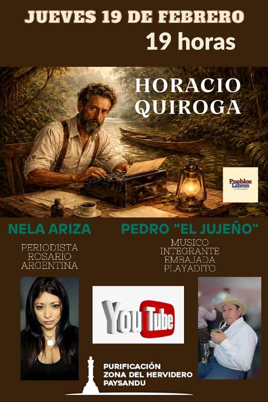 La página Pueblos Libres Cultura e Historia, a cargo del gestor Carlos Fagundez, presenta el evento virtual “Homenaje a Horacio Quiroga”, a realizarse este jueves 19 de febrero, a las 19 horas, a través de Youtube: Purificación Zona del Hervidero Paysandú, y StreamYard: Pueblo Libres.