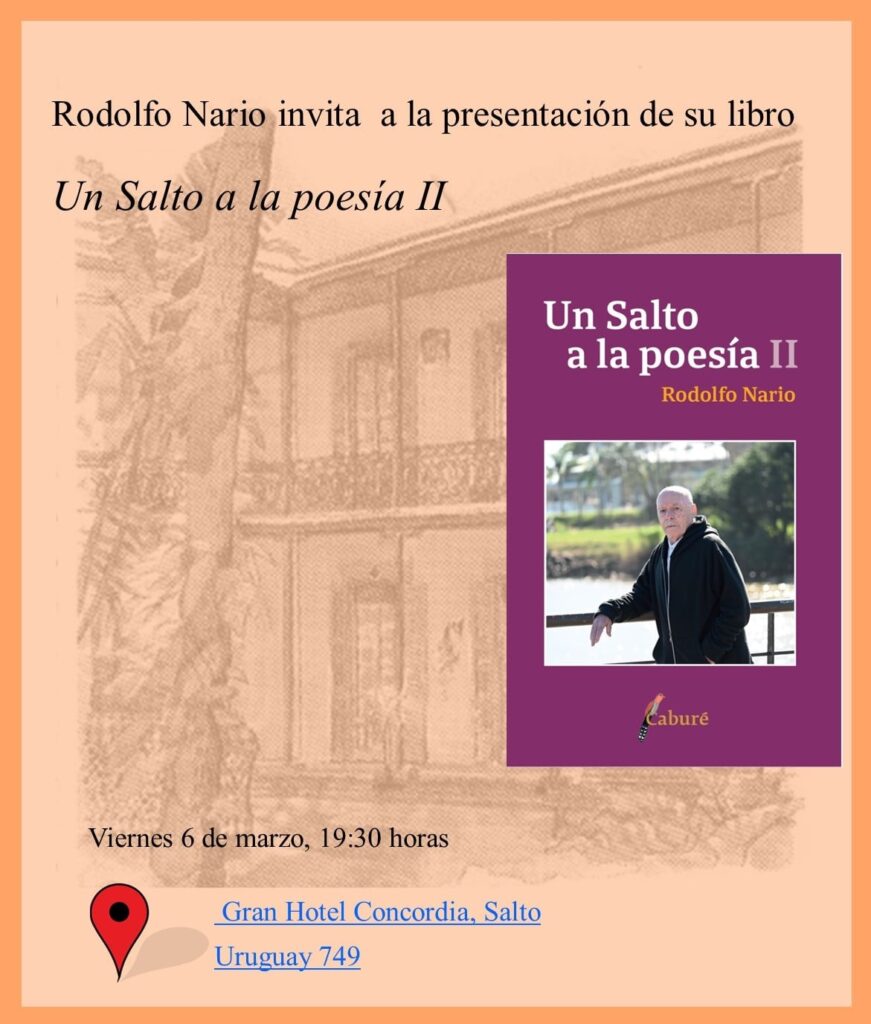 Para hoy viernes 6 de marzo, a partir de las 19.30 horas, en instalaciones del Centro Cultural del Gran Hotel Concordia, está prevista la presentación de la obra «Un Salto a la poesía II», de Rodolfo Nario.