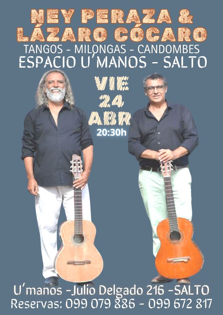 El guitarrista Ney Peraza y el cantor Lázaro Cócaro presentan su repertorio de milongas, tangos, candombes y MPU. Se trata de un variado recorrido musical, donde se ofrecen obras de los autores más representativos de la música uruguaya de todos los tiempos.