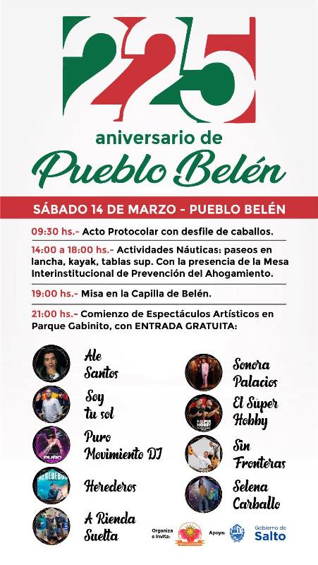 Las actividades darán inicio a la hora 09:30 con el acto protocolar central, el cual contará con el tradicional desfile de caballería gaucha. Durante la tarde, los eventos se trasladarán a la zona de la costa. De 14:00 a 18:00 horas, se llevarán a cabo diversas actividades náuticas que incluyen paseos en lancha, kayak y tablas de SUP. Estas instancias cuentan con el respaldo y la supervisión de la Mesa Interinstitucional de Prevención del Ahogamiento, garantizando un entorno seguro para el disfrute de las familias. Posteriormente, a las 19:00 horas, se realizará la celebración de la Santa Misa en la Capilla de Belén.