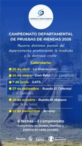 de Pruebas de Riendas 2026 ya cuenta con su calendario oficial, consolidando una propuesta que recorre distintos puntos del departamento y promueve la tradición, la destreza criolla y el encuentro de jinetes y público en cada jornada.