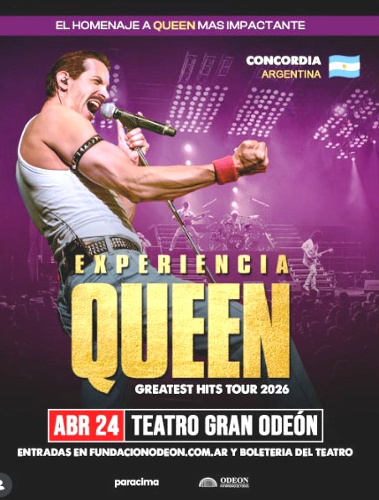 Experiencia Queen, Greatest Hits Tour 2026. 24 abril Lugar: Teatro Odeón (Concordia) Hora: 21:00 Costo: Teatro Odeón (Concordia)24 de abril – 21hsViví la magia de Queen como nunca antesEntradas en: www.fundacionodeon.com.aro en boletería desde las 18 hsInfo: 345 4226 655 !Compártelo!