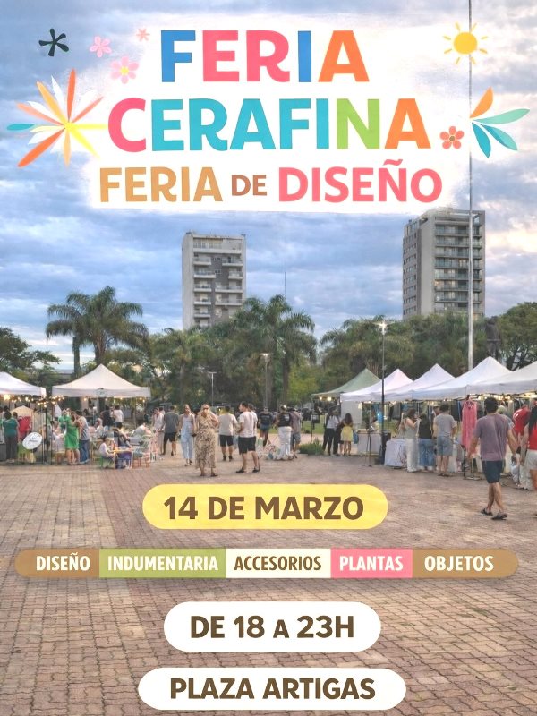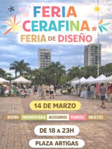 FERIA CERAFINA 14 marzo Lugar: Plaza Artigas Hora: 18:00 Costo: FERIA CERAFINASábado 14 | 18 hsPlaza Artigas|Diseño|Indumentaria|Accesorios|Plantas| y mucho más… !Compártelo!