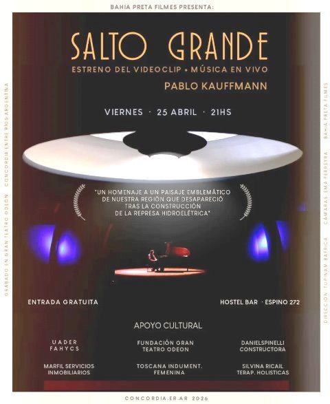 El sábado 25 de abril a las 21hs, el pianista Pablo Kauffmann presentará en formato audiovisual su obra «Salto Grande», un homenaje a un paisaje emblemático de nuestra región que desapareció tras la construcción de la represa hidroeléctrica homónima. El encuentro se realizará en el Hostel Concordia (Espino 272), con entrada libre y gratuita, abierta a toda la comunidad.